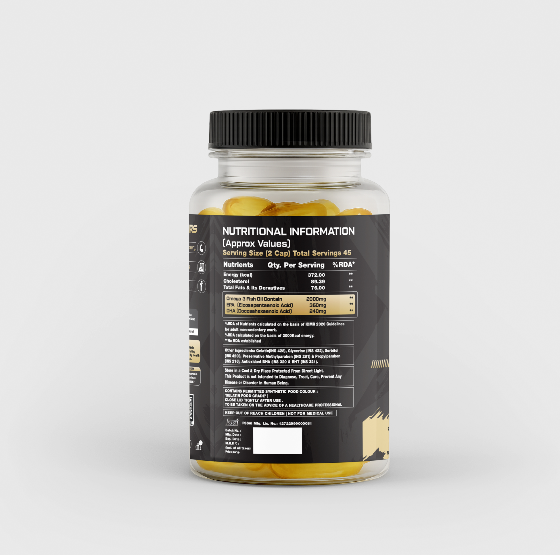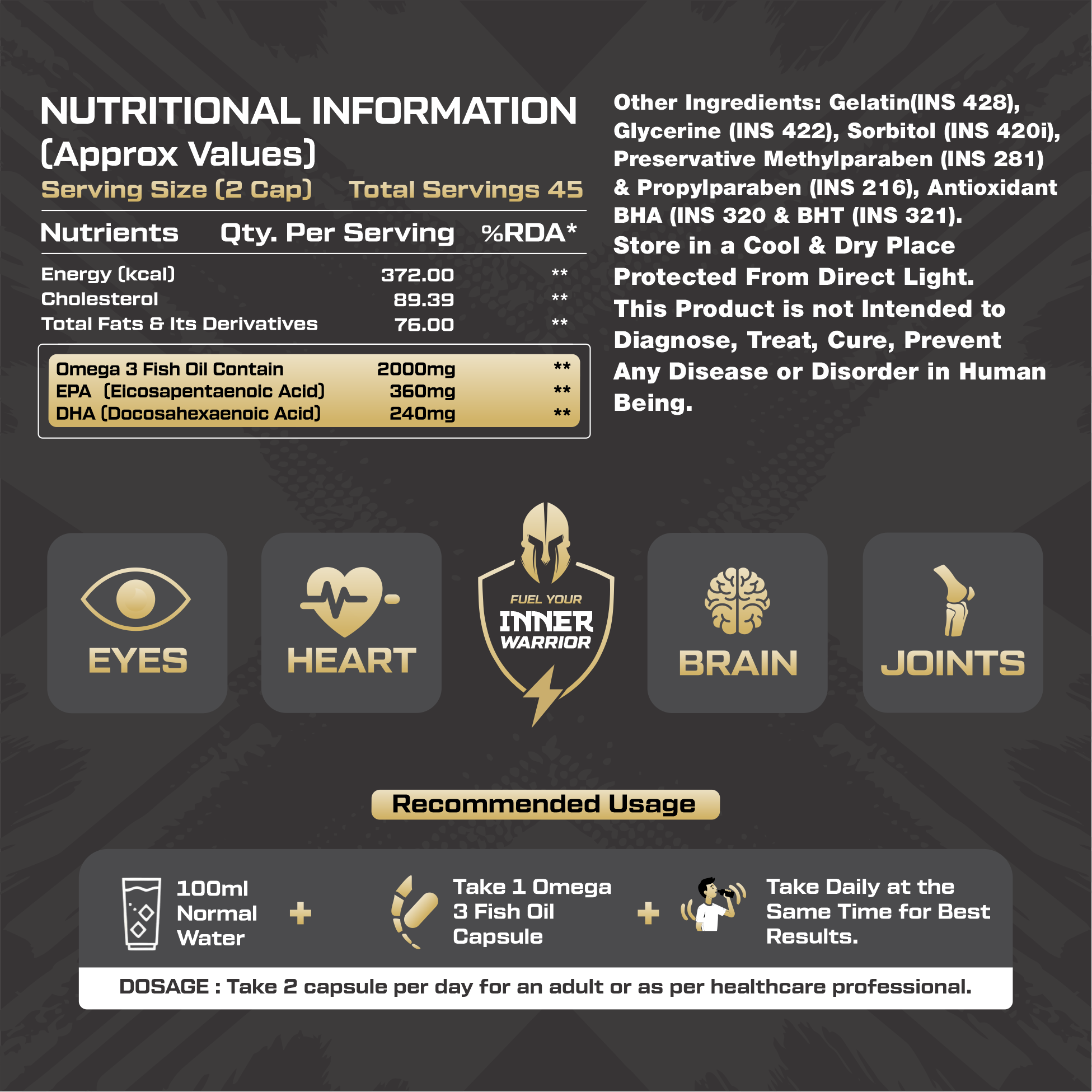 Elevate your wellness with Nutra Warrior Omega-3 Fish Oil, a double-strength formula packed with EPA (360 mg) and DHA (240 mg) to support heart, brain, joints, and overall vitality. With 2000 mg of premium Omega-3 per serving, it helps improve cardiovascular health, eye function, immunity, and post-workout recovery. Designed for athletes, professionals, and fitness warriors, this fish oil supplement reduces inflammation, boosts stamina, and promotes a balanced lifestyle. Tested for purity and heavy metals, itβs cholesterol-free and crafted for superior absorption without fishy burps. Power your body with natureβs essential fatty acidsβ fuel your inner warrior every day.