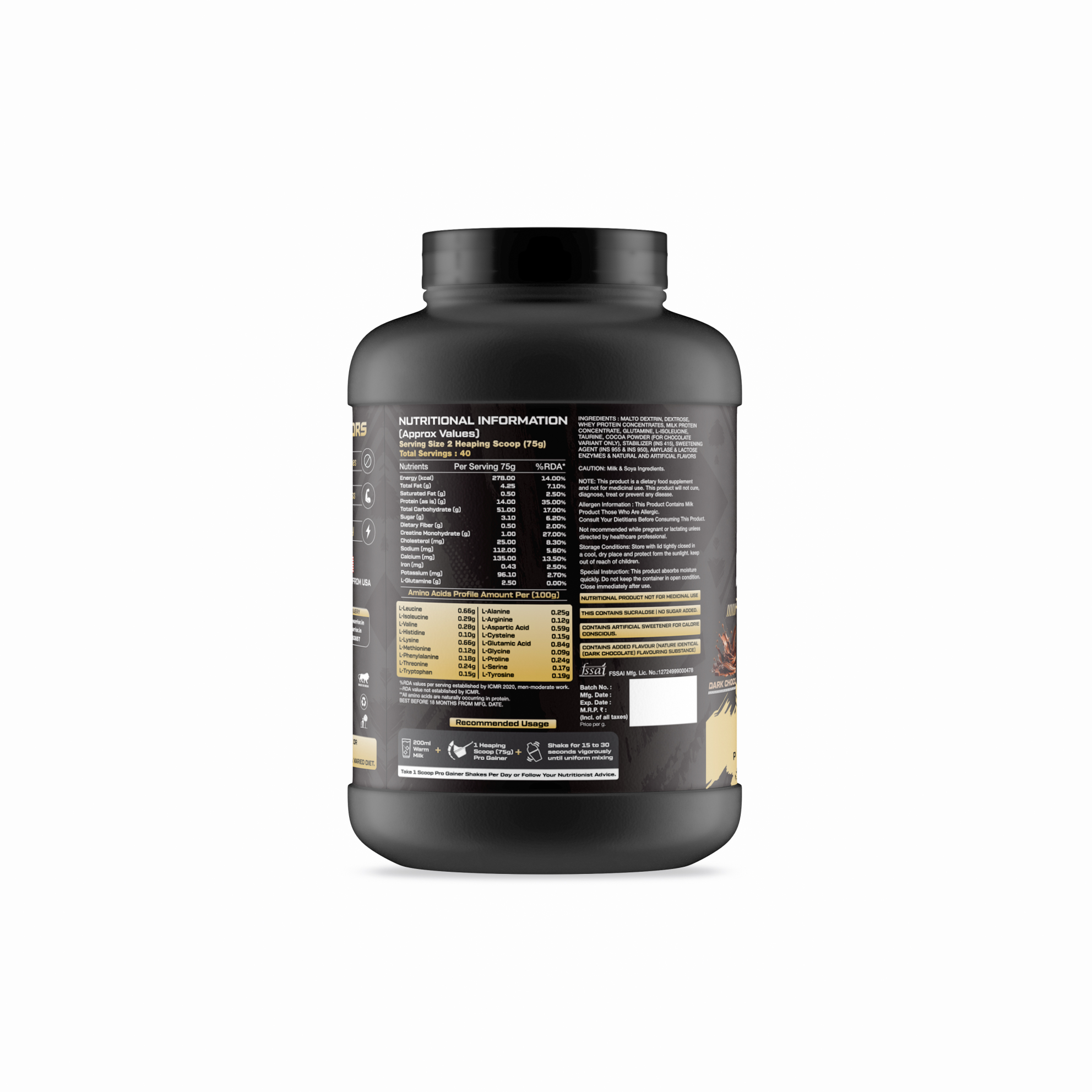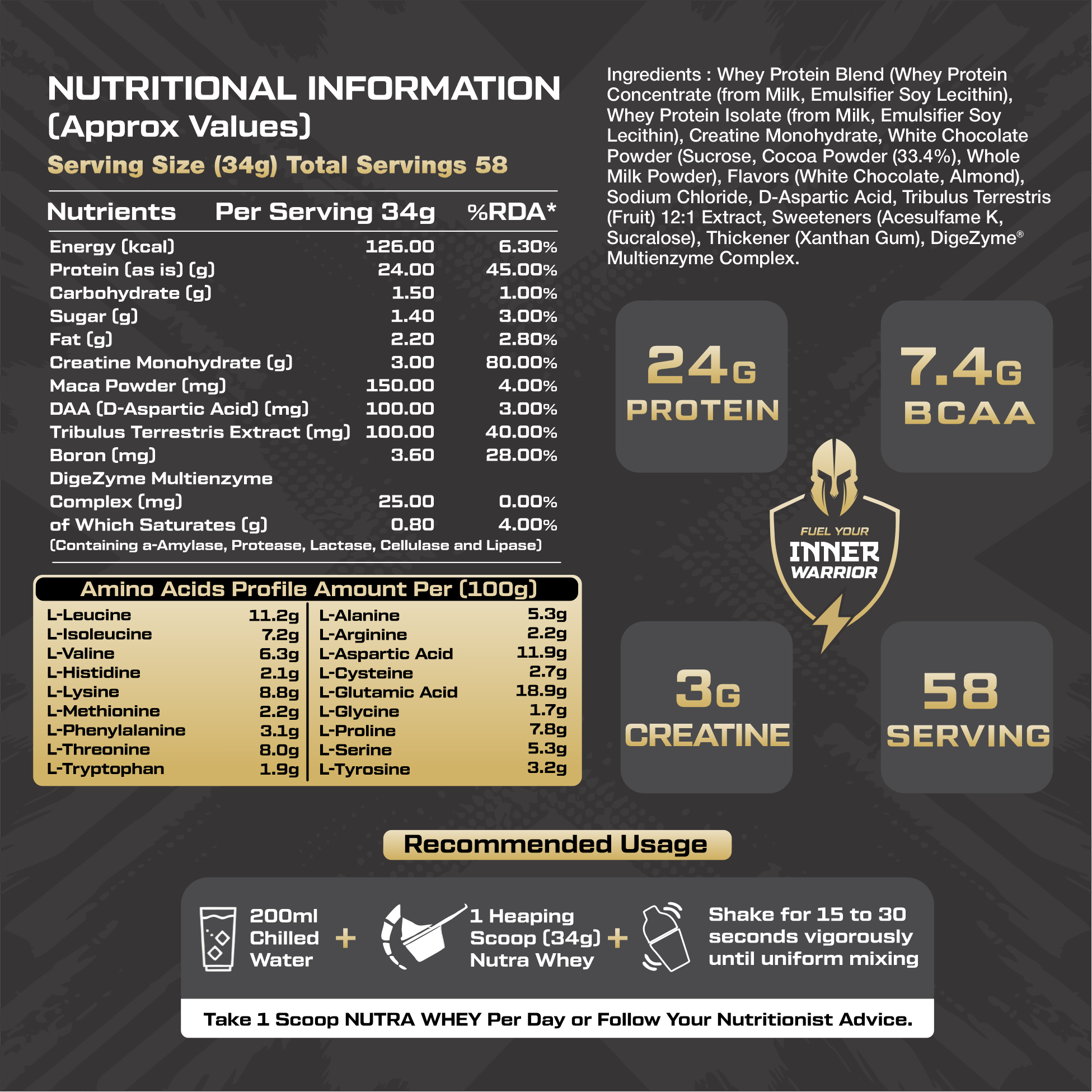 Mix 1 scoop (70g) with 250–300 ml of milk or water. Shake/stir well for 20 seconds. Best consumed post-workout or in-between meals.